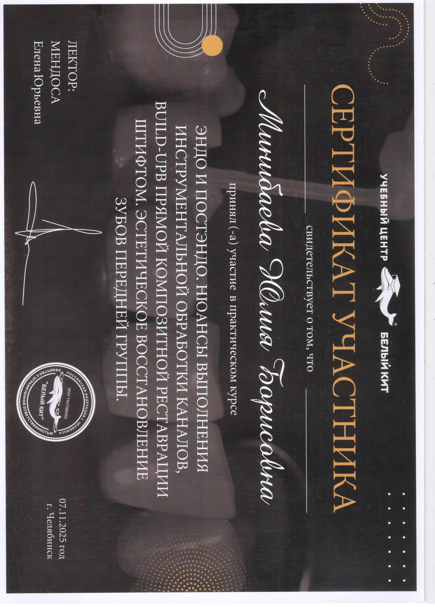 - Профессиональная переподготовка: ООО «МЦ «Дельта плюс» СП «Учебный центр «Дельта Мед», 2018 г., по программе "Стоматология ортопедическая". Допущена к осуществлению медицинской и фармацевтической деятельности по специальности "Стоматология ортопедическая". Срок действия сертификата до ноября 2023 г. ФГБОУ ДПО "Российская медицинская академия непрерывного профессиоального образоания" Министерства здравоохранения Российской Федерации, 2023 г. ФГБОУ ДПО РМАНПО Минздрава России, 2023 г. Периодическая аккредитация. Специальность "Стоматология ортопедическая". Решение аккредитационной комиссии действительно до 29.08.2028 г.